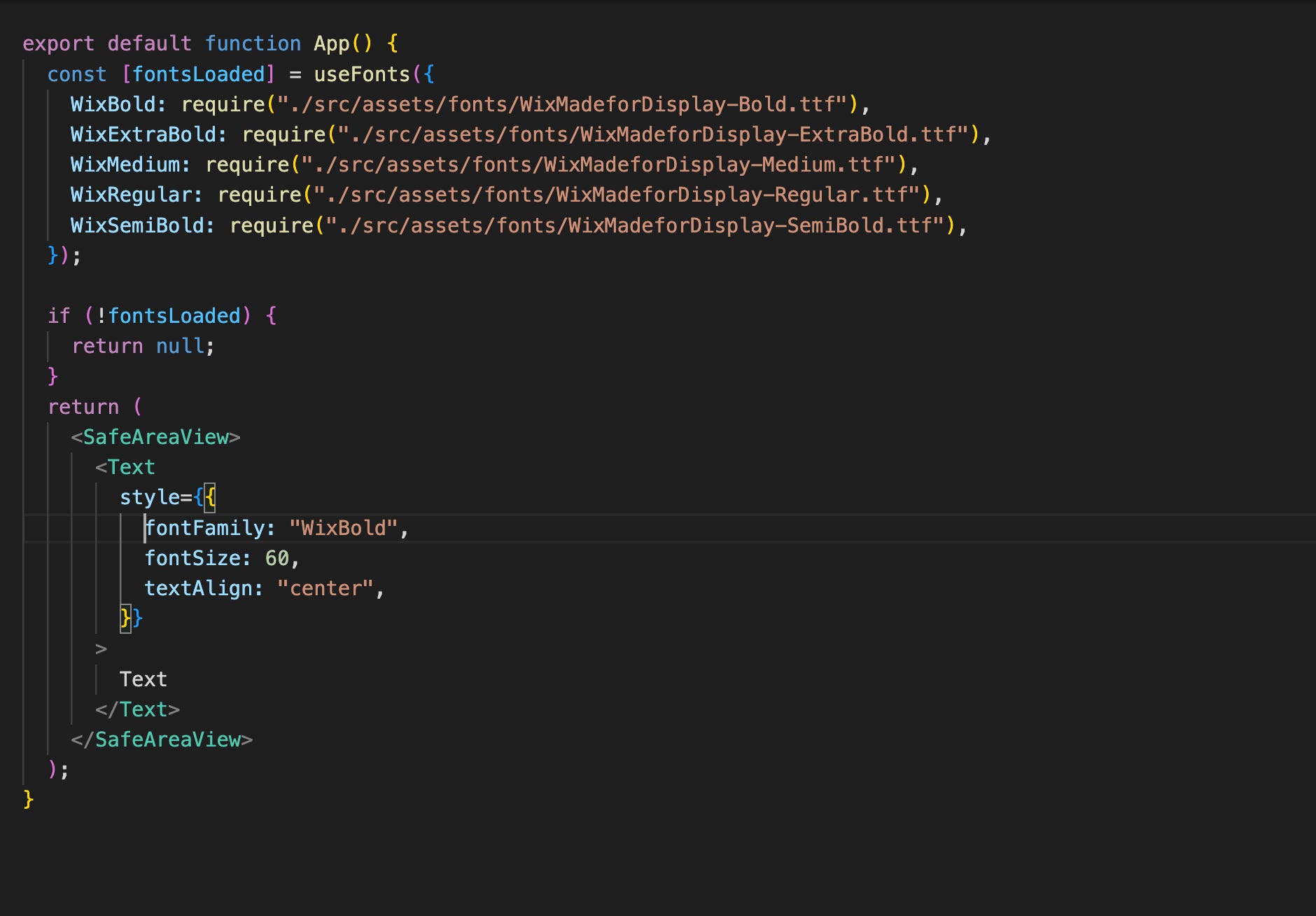 The useFonts function takes an object with the key being the name (you can name it whatever you want) we’ll reference in our style object (i.e., “WixBold”) and the value being the location of the font we want to use.